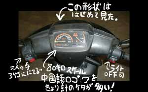 このバイクの紹介ですがヤマハアクシス90を中国にて商標までコピーした機体(アクシス90を知らない人に「ちょっと大きなJOG」と言われます)です。 でも90ccを50ccにグレードダウンしているところが凄いです。またシートは二人乗り用になっているのでゆったりと乗れます。スピードメーターも80km/hまで表示できるので日本車のような60km/h以上出していても正確な速度が分からなくなることがないのです。 なお改造などはしていません(僕があまりにも無知な為に・・・)紹介はこんなところです。