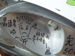 (→)は、レンズを外したテールランプのリフレクターにかかれた落書きのようですね。仲間達の想いが込められてるってカンジです(^^)