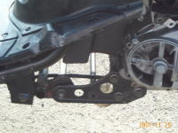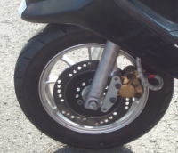 キャリパーサポートを介してヤマンボキャリパーを装着しているようです。ずいぶん大きなディスクですねえ〜