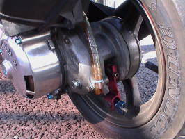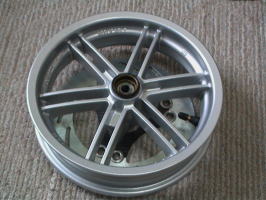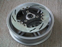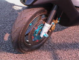 これはカッコイイ!アルミホイールです。 ただし、台湾のDioは国内物に比べてフロントアクスルシャフト直径が大きいため、フロントのボルトオンはできないそうです。 カーボンプレートつきの大径ブレーキディスクも装着済みです!