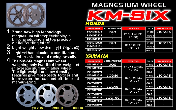 KN企画さんオークションにはいろんなものが隠れてる・・・ このところ、台湾製部品も入手できるようになってきました。だいたいは、ネットオークションなどで個人売買というかたちで販売されている事が多いですね。で、あるときBBSでもこの手の部品の話題が上がったんです。 そこに上がったリンクを辿ると、そこにはFSN製のキャストホイールの写真が! 実は僕、以前hakurinさんから聞いていたKOSO製マグネシウムホイールが欲しかったので、だめもとで出店者の方に質問してみたんですよ!!! で、出展者の方からの回答でホームページに遊びにきませんか?との事でしたので、いってみました。それがこの「KN企画」さんなんですね〜ホームページはまだまだできたばっかりみたいでしたが、台湾から直接パーツを買い付けておられる方のようでしたし、台湾部品に興味を持つ知り合いの方も多かったので、みんなに紹介することにしました。