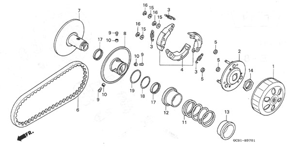 | それは、とあるBBSでDio用のトルクカムの話しをしているときのことだった。 「ジョルノクレアのトルクカムがいいらしいですよ。」 「でも、たしかクレアのパーツリストを見たら、トルクカムはCリングで固定するようになっていたんで、互換性はないと思って諦めたんですよ。」 「えっ!ホントですか!?確認してみます〜」 フクちゃん工場長に聞いてみると 「ああ、両方あるんですよ。多分マイナーチェンジで変わったんじゃないですかねー」 とのこと。 そんなわけで、翌日バイク屋に行って、クレアのパーツリストを見てみると・・・ ![]()