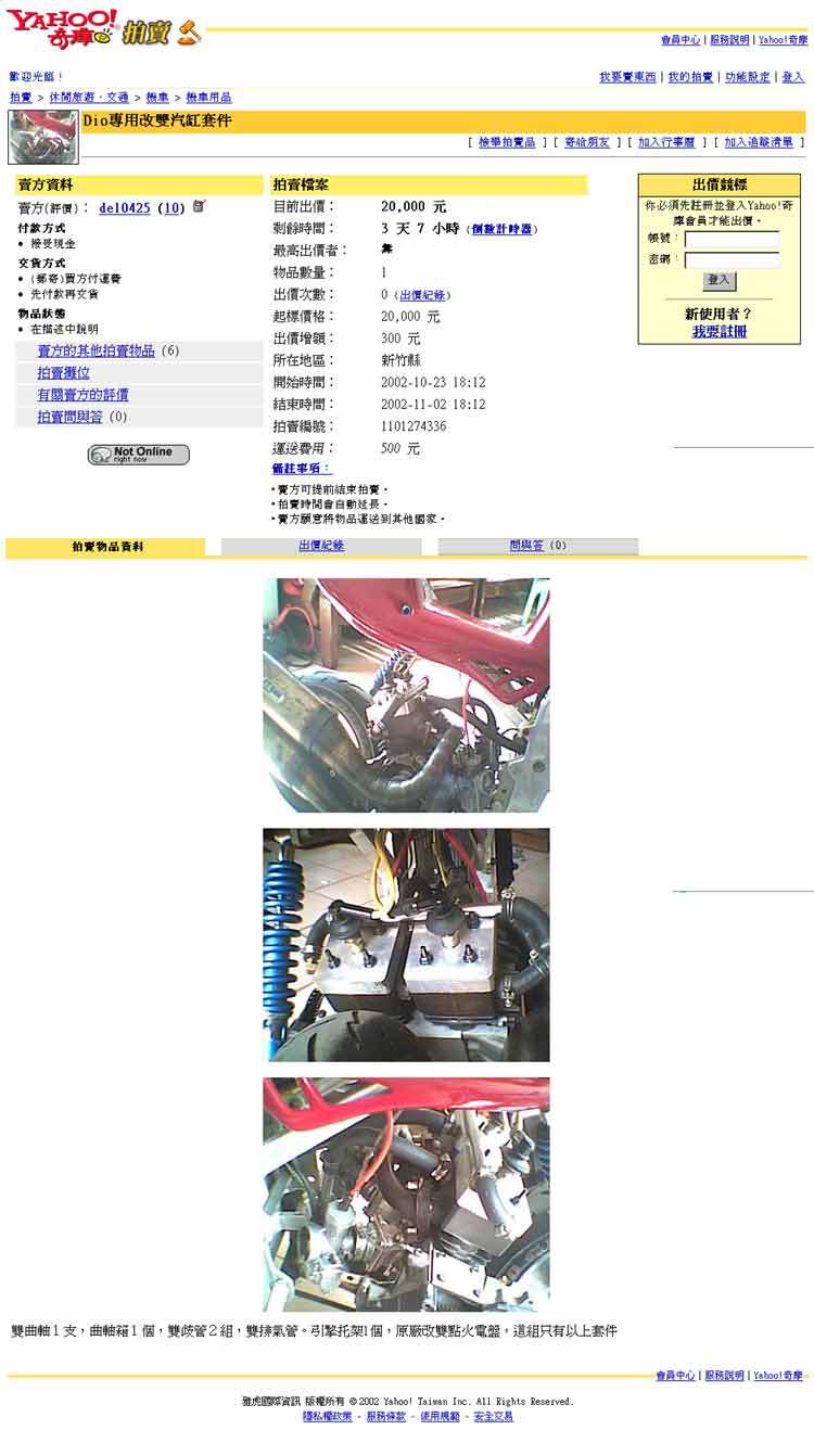 おわかりいただけますか!? これ、台湾版のヤフーオークションなんですよ!!!、つまりこれは、このエンジンキットが売られているって事なんです。 キット販売ということですが、どこからどこまでのパーツが含まれているのかは上の画面の中文を解読しないとわかりませんが。入札者はいないものの、この時の価格が20000元となっています。これを日本円に換算すると、約¥71,000前後です! 安いんじゃーないですか!?もし台湾のネットオークションから物を自由に買う手段があったら入札いれてますよこれは! 正直・・・欲しい!!!!!(笑 参考:SYM製DIO派生機の資料。