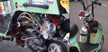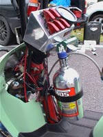 燃料の調整法は、単純にインジェクターの出口口径をメインジェットのように交換して決めます。亜酸化窒素も基本的に同じ事なんですが、ちょっと他の条件も考えないといけなくなります。なぜなら、燃料は燃料ポンプによって一定の圧力で供給されるので、出口を調整すればいいだけなんですが。亜酸化窒素の方は封じ込められているガスが出ていこうとする圧力をそのまま使っているからなのです。そのガスの圧力はまわりの気温によって変化するので、気温による条件も考慮しなくてはならないのです。これが結構変化するそうで。ただでさえキャブレター調整でも気温とか考えなければいけないのに、もうひとつややこしいことが増えちゃってるって訳ですね。
