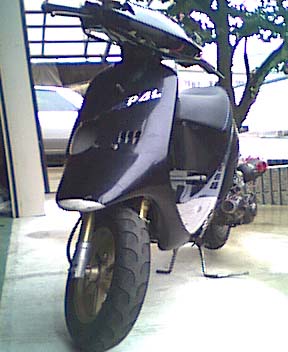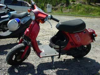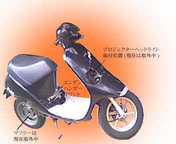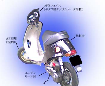 | その後、更なるパワーを目指し、エンヂンはリード90用のHF05Eに換装。AF17−H2、エヴォリューションUとなりました。別名ハンドレットチャレンジャー、つまり100キロを目指すマシンです。この時点で、エンヂン本体には排気ポート周りの小変更とハイスピードプーリ、Dio用エアクリーナを装着したライトチューンでした。 結果的に、このマシンは見事目標速度に到達。A工房として初の大台に乗ったマシンでした。 それからしばらくの後、f・factoryフクちゃん工場長の発案によりこのエンヂンをAF28に搭載。AF25のエンヂンハンガーをAF28に使用することにより、小加工でAF28にHF05Eがマウント可能ではないかというアイデアでした。 このアイデアを実現するにあたり、A工房が実際に行った加工はセンタースタンドマウント周りの車体の切り取り、セルモータ及びオイルポンプの撤去です。この程度の加工で搭載可能なのであれば、かなり容易であると言えるでしょう。 このマシンはエヴォリューションVとして、その後正月決死隊ツーリングに向けてグランドスラムマフラー、PE24キャブレター、キタコハイギヤを搭載。エキゾーストを大破する直前に115キロという大記録を達成することになりました。 | |