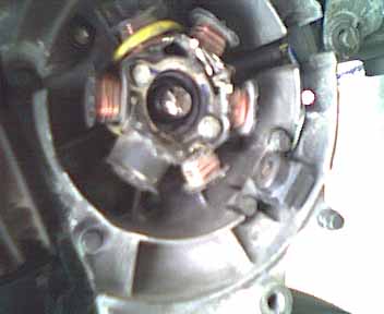 | この構想により制作された最初のマシンがAF17改、エヴォリューションTです。このマシンでは、中古のAF17にAF18Eを搭載しました。エンヂンハンガーは車体側のマウント幅があわないため市販のステイにより車体側に取付位置を追加するという工法をとりました。強度・信頼性において多少の不安の残る方法ではありましたが、実際の走行に際してはそれほど問題にならない事が判明。以後、この工法に活路を見いだすこととなります。 又、電装系についてはさしたる問題もなく、配線色の同一なものを接続すれば運用可能でした。これを利用し、市販のコネクタで車体ハーネスを加工することにより、何の問題もなくエンジンが搭載可能となりました。この配線の互換性についても、以後の発展に多大な影響があったと言えるでしょう。 | |