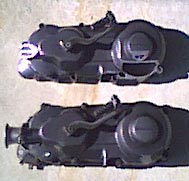 こーなったら、ケースカバーを削ってみましょう!!特に後ろのクラッチ部分が出っ張っているようなので、これをサンダーで削ってみました。 しかしあまり削ると、中のクラッチアウターがもろに出てしまって危険です。転倒などの場合にクラッチアウターに衝撃が加わると、クラッチだけでなくファイナルの軸やベアリングにまで被害が及ぶ可能性も考えられます。だからできるだけその辺を問題が出ないように削る必要がありますね。 |