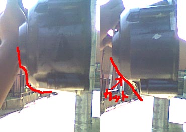 (ノーマル/加工後) どうでしょう?このように削ることにより、果たしてどのくらいバンク角が向上するのかきちんと計算したわけではありませんが、当初の状態よりはだいぶ良くなっていると思います。 組んで傾けてみましたが、確かにバンク角の向上はできたようです。実際に走行してみたところ、タイヤ外径のアップと相まってバンク角度の向上に一応成功しています。が、実際のサーキット走行では普段の街乗りではできないようなコーナリングをしますから、はたしてこれで十分かどうかは走ってみなければわかりません。 |