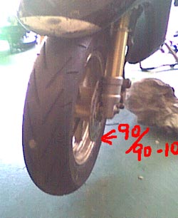 フロントタイヤも交換! 今回はリッチにフロントタイヤも交換してみました!90/90−10のダンロップTT91です。元々入っていたのがライブDio純正のIRC製90/90−10だったため、特別問題は出ないと思っていましたが・・・実際に走行してみると、サスがフルボトムした場合にフロントカウルの内側に僅かに接触しているようです。恐らくはタイヤの銘柄による微妙なサイズの違い、摩耗の度合いなどが起因して、これまで問題にならなかったのだと思います。