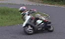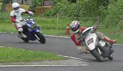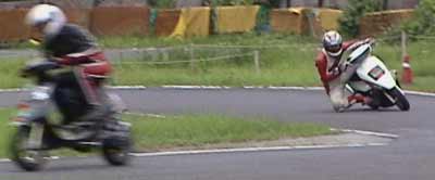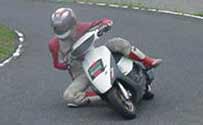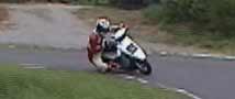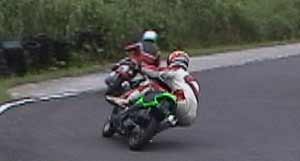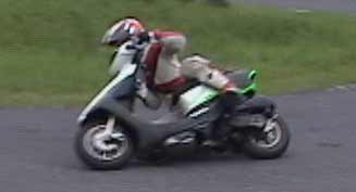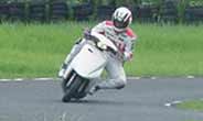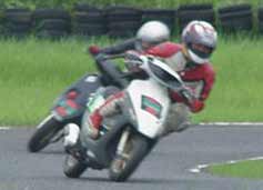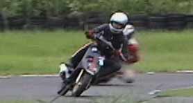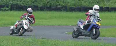 | てつさんのBW`s100 おそらく最もサーキットに向いてなかったと思われるてつさんのBW`s100バーハン仕様です。音速塾の駆動系チューンを施しているらしく、パワーはあります。が、いかんせんサイズが・・ しかしてつさんはそれもはねのけるくらいがんばって走っていました。 |