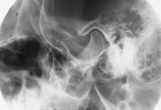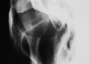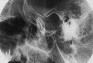 これは、左の顎関節部のシューラー法という、レントゲン写真です。この方法では、顎関節部を非常に良く観察することが出来ます。