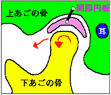 緑色で描いたのは、上顎骨の関節突起と側頭骨。