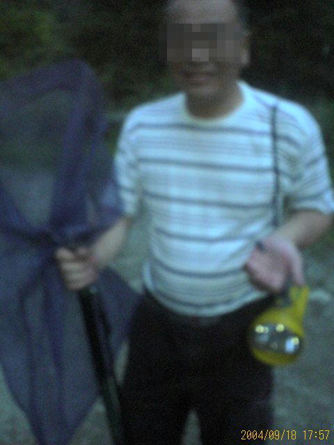 ヒメオオを狙うタカさん 向こうに山がある。 「登るのは無理だよ。」 とタカさん。 なにも登れ、って言ってないのにぃ。(^^; 夕暮れ、もうナンにも見えない。 懐中電灯でも暗い。 すると、 「いたいた。」と私。 「どこによ。」とタカさん。 懐中電灯でも落ちちゃう。 そーっと、そーっと、