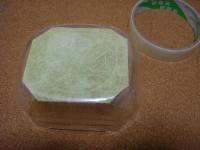 | 不織布をセロテープで蓋に貼りつけます。 このときの貼りつけ方に注意。不織布の周りにいっさい隙間ができないようにテープを貼ります。 安物テープを使うと、しばらくしてはがれてきます。写真のは使えるテープ。ニチバンのセロテープ。 |