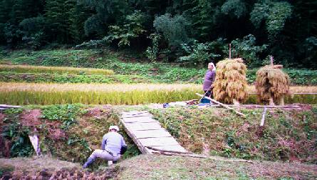 収穫の秋 この田んぼは1997年秋で耕作を終了しました。もうこの風景は見ることが出来ません。