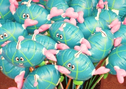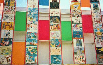 可愛いマスコットキャラクター(パピットくん)の風船たち(写真左)。パビリオンの外はちょっとしたお祭りの雰囲気。 「世界をむすぶ人と心」をテーマに、未来の宇宙開発、コミニュケーションなどを紹介しています。各コーナーともスクリーン映像やコンピューターを駆使し、先端の創造を演出していました。