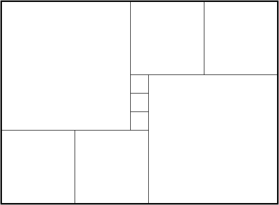 このパズルは、与えられた長方形に正方形をすき間なく、また重ねることなしに敷き詰めることが目的です。 いくつかの正方形に分割された長方形が提示されます。 もとの長方形の大きさと敷き詰めるために必要な正方形の個数及び各正方形の大きさが提示されます。 もとの長方形の大きさと敷き詰めるために必要な正方形の個数が提示されます。 |
