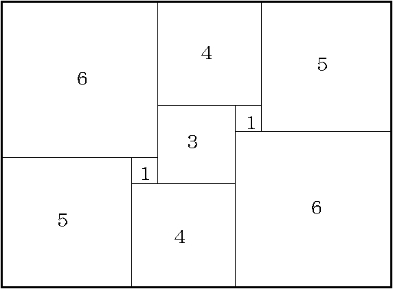 たての長さ11、横の長さ15の長方形に、次の9個の正方形をしき詰めてください。 *** 1,1,3,4,4,5,5,6,6 *** しき詰めたときに、もとの長方形の辺と接しない(完全に中に入っている)正方形を、小さい物から順に答えてください。 |