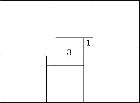 9個の正方形に分割された長方形があります。そのうち、2個の正方形の一辺の長さは「1」、「3」とわかっています。 この長方形のたての長さと横の長さを求めなさい。 |