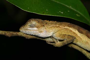 | 林内でよく見かける.しぐさのひょうきんなかわいらしいトカゲである.結構どじで簡単に捕まえることができる. 下左のトカゲは逃げ回っている間に人の手に乗ってしまったものである.アオカナヘビやイシガキトカゲなどではこんなことは絶対におこらない. 夜は,木の枝などにしがみついて目をつぶって眠る.ただし,懐中電灯の光をあてるとすぐに目を開けてしまうのでなかなかその姿をじっくりと眺めることはできない.下右の個体はぐっすりと眠っていたらしくて,写真を撮ることができた. | |