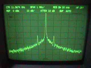 さて、でも、箱ができてしまえば、後はさほどやっかいではない。基板を組みこみ、電圧テストをしてからFETを取りつけた。調整は、スペアナを見ながら、逓倍段の入力トリマで目的信号が強くなるようにする。次にアンプのバイアスをいじると11Gがガツンと強くなった。(最初はショボくて焦ったが、アンプが止まっていたのだ。)三番目にスタブをつけるのだが、私の場合、逓倍段からBPFへの入り口に一つ、BPFのセンターに一つ、アンプ部のゲート前に一つ の合計三つとなった。特にBPFの真中がとてもシビアだった。1mWから10mwへ、10dBくらいの違いがスタブの微調整で出る感じだった。