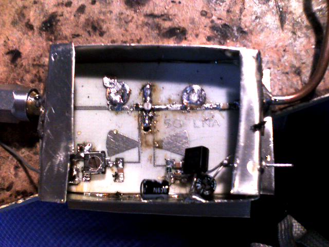 受信20dBゲインをめざす。こちらには秋月の0.5mmガラエポ基板を使った。10Gはどうも手ごろなMMICがなく、NE3210S01をいれるべ