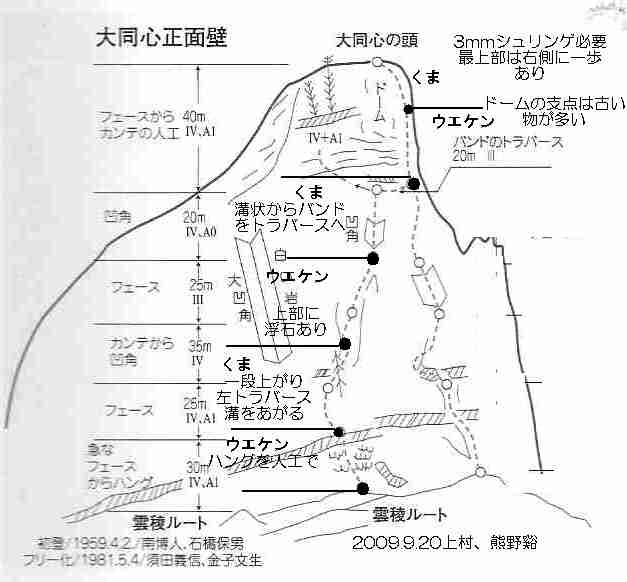 北岳バットレス中央稜の余韻から一ヶ月。「次は秋の大同心」と決めていたが、人工登攀は初めてだ。練習に行ったストマジで「大同心正面壁雲稜ルートのフリー化ルート図」を見て、アブミを持てばなんとか登れそうだ、と踏ん切りがついた。