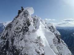 その後は、頂上にあがる雪壁と雪庇の乗り越えが待つ。どこから越えるか…三人であーでもない、こーでもないと思案しつつ、左の雪庇の切れていそうな場所に向かう。雪がグサグサで支持力がないのだが、ダマシダマシでステップを固めて乗り越える…