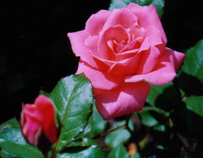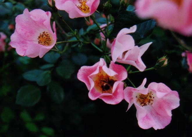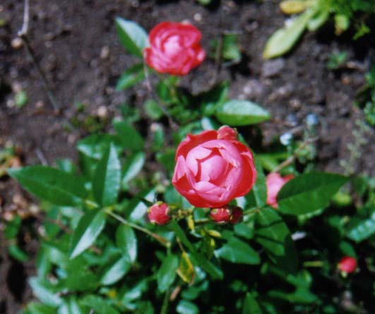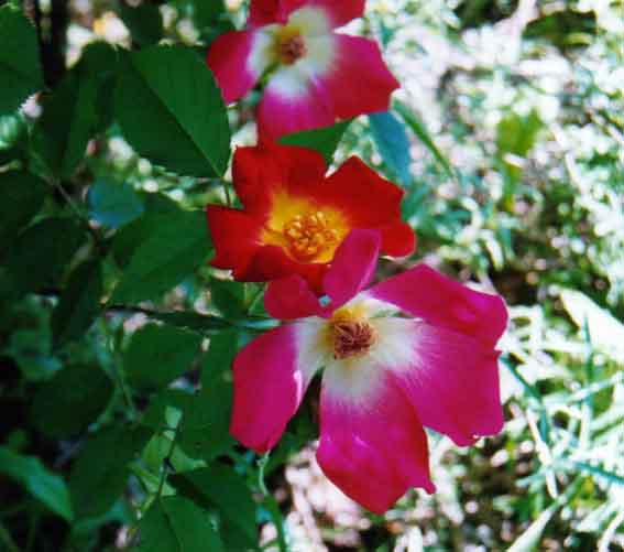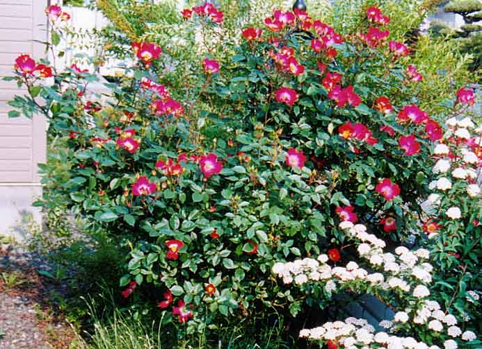 | 右はほんとの色は黄色なのに、 なぜか、年月とともに赤が入ってきた。 どうやら、土がアルカリ性らしい。 どの花も何年かすると濃いピンクがかって来る。 |
