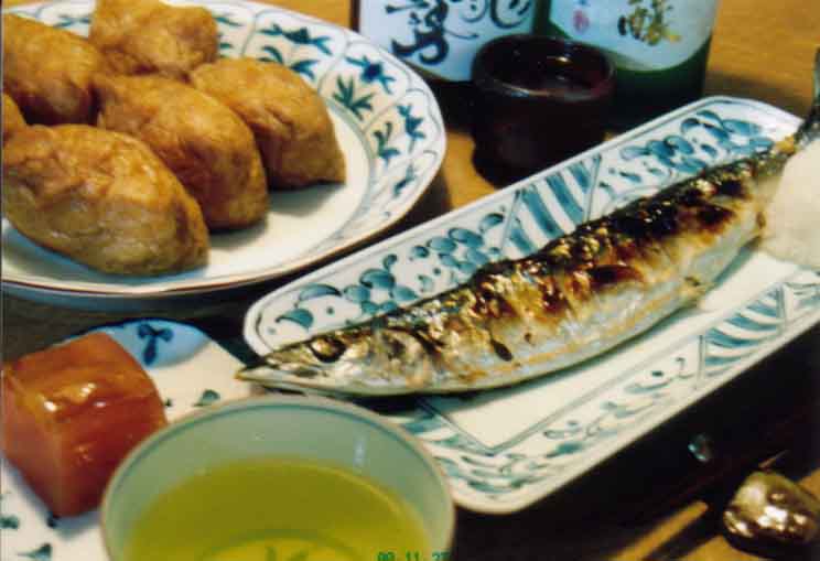 お品書き 秋刀魚 稲荷寿司 酒 柿羊羹 渋茶 |