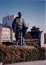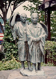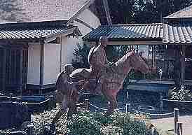 泊数の多さに敬意を表してか、町内には「奥の細道」関連の句碑やら記念スタンプやらがそちこちに。お供の曽良(そら)を従えた芭蕉像は「芭蕉の館」前に。ここでは、奥の細道の行程や芭蕉の文学についていろいろと学べますから、興味のある方は是非どうぞ!(95/11)
