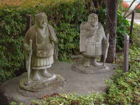 文知摺観音(↑)からの帰り、バスを降りた目の前で、日だまりで暖かそうにしている芭蕉さん、曽良さんと出くわしました。