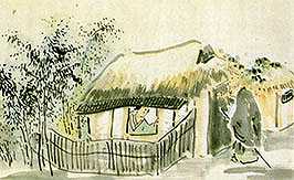 この粗末で荒れた家が等裁宅に違いないと思って門を叩くと、なかから侘びしげな女が。やはり等裁の家でした。