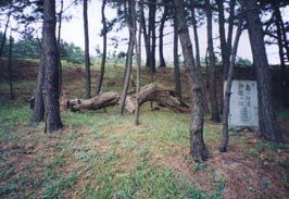 ゴルフ場の方の後をついてゆき(わざわざ時間を割いていただき、ありがとうございました)歩くこと5分ほど。眼下に日本海を見渡せる所までたどり着くと、ヒョロヒョロの松林の中に横たわる汐越の松の残骸がありました。脇にたつ碑がなければ、ただのゴミとされてしまうでしょうね。その昔、風流人どもが感興にふけった地。今の世、ゴルフに興じる人たちがいる。こんな時代の移り変わりを眼前にするのも「奥の細道」の旅の一興だったりする訳であります。