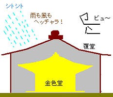 さて、黄金に彩られたこの堂を風雨から保護するために、覆堂(さやどう/おおいどう)が建てられています。