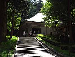 高館から10分ほど歩くと中尊寺(ちゅうそんじ)。駐車場や土産物屋で賑わう麓から「月光坂」と呼ばれる長い長い坂道を上りきり、幾ばくかの拝観料を納めると、いよいよ光堂こと金色堂(こんじきどう)を目前にできます。