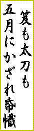 - 五月の初めなので(あちこちに)紙幟がひるがえっている。笈も太刀も飾って(端午の節句を祝ってもらいたい)。