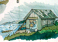 闇中に莫作(もさく)して「雨もまた、奇なり」とせば、「雨後の晴色(せいしょく)、また頼もしき」と、蜑(あま)の苫屋に膝を入て、雨の晴るゝを待つ。
