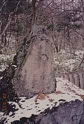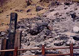 右の写真が現在の殺生石。大小の岩がゴロゴロ転がる山腹から、硫化水素、亜硫酸ガスなどが噴出し、付近には異様な臭気が漂います。時期が時期だけに(12月)ハチやチョウの死骸が累々と重なっているなんて有様は見られませんでしたが。