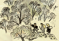 雨にたたられ堺田の封人の家に2泊した芭蕉は、五月十七日(陽暦7月3日)尾花沢へ向かい出発。封人の家の主からは「この先は山越えがあり道もはっきり分からないから、道案内の人間を付けた方がよい」との勧めを受け、「究竟(くっきょう)の若もの」に先導を頼むことになりました。ところでこの先山刀伐峠(なたぎりとうげ)は深い山のなか、山賊も出るという・・。