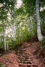 芭蕉が「山賊が出はしまいか」と恐る恐る越えた道は、現在遊歩道として整備されています。山刀伐トンネル入口から遊歩道を歩いて40分。標高差にして140mほど。右写真『奥の細道』文学碑の建つ頂上にたどりつきました。