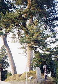 右の写真は、現在の「末の松山」。仲睦まじい男女のように2本の松の木が寄り添っているようにも見えます。