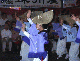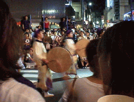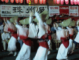 | 町中のあちこちの商店街に100〜200mぐらいの「演舞場」が設けられ、70近い「連」というグループが次々と踊り歩きます。 |