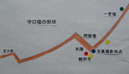 「 その前に、ここ、守口宿・文禄堤はミュージアムそのものだ、という考え方があるんだけど、ここに立った時、たとえば、江戸時代がわかる、ということなんだ。江戸時代といったっていろいろあるわけだから、本質的なところで江戸時代がわかる、という何かがあるんだ。明智先生は、たとえば、街道のかぎ形に江戸時代が隠されている、という見方をしておられるんだ 」