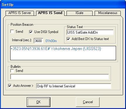 ● (No.562) How to SatGate using UISS only (2008年4月18日) --------------------------------------------------------- ↓ GO-32 受信時の図UISS のみを用いて、UI-View32 を使わずに APRS に接続する方法が確立できま した。 UISS Modules (addon) の、『UISS-SatGate Ver1.0』プログラムを使用 する方法です。ただし以下に述べる方法は、UISS Pro-Edition でのみ有効です。 (1) 最初に、UISS - Setup - Extra で AGWPE を自動起動する設定にしておく。 (2) http://users.belgacom.net/hamradio/uissmodules.htm のページ上から、 『UISS-SatGate.zip』をダウンロードし、UISS と同じフォルダに解凍する。 (3) 次に UISS を立ち上げると、自動的に Modules タブに、『UISS-SatGate』 が組み込まれている。下の画像のように設定しておくと、UISS の立ち上げ と同時に『UISS-SatGate』が起動する。 (4) 上図の APRS Host Server の Connect ボタンを押す。 APRS IS Server の接続先 Host は、satgate.aprsca.net 日本の接続先 Host は、aprsjp.net (5) あとは、以前と同様の APRS 運用方法で、UISS による各衛星へのアクセス のログが findu.com に記録されていく。 (6) 最下段の図中に見える「EAX25」プロトコルについては、次項 参照。