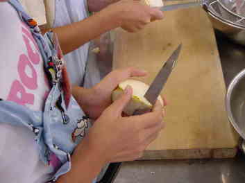 今回の流れ | つくり方 | 動画を見る 「缶詰を開ける」その1、その2 「皮むき」 「だんごをこねる」その1、その2 「ゴマをする」 |