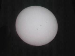 | 口径5cmの地上用望遠鏡(倍率20倍)で太陽を投影してみました。 横から撮影しているので,写真の太陽は丸く写っていません。 気流が不安定でしたが,大きな黒点がいくつか見えます。 |