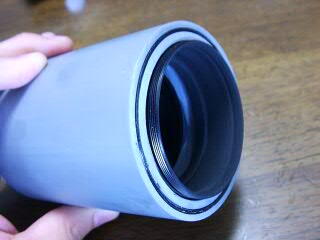 筒は軽量で加工が楽な塩ビ管です。水道管などに使うVU65と言う規格のを使いました。これは内径が67mmほどあります。レンズの直径は62mm(実寸)ですから,塩ビ管の内側に0.5mm厚の黒い塩ビシートを積層し,内径を狭くします。VU65よりひと回り小さい,VU50管用のジョイントが,ちょうど内径60mmだったので,これを薄い輪切りにして艶消し塗装し,レンズ押さえにします。あとは艶消しと固定を兼ねて,植毛紙をベタベタ貼って,対物部が完成です。