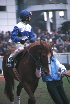 今回もプラス4kgで登場。いかにも太いと分かる状態 でりっぱさだけが目立つ。 でもこれで勝てる様だと一躍クラシック候補と期待し ながらの観戦。 1600m芝の予定が前日の降雪の影響で1200mのダ ートに変更された。 スタート。出負けして2の脚もなく後方を進み,4コーナ から直線追い上げ7着。最後は見どころあり。やっぱり, 1200mは短過ぎるみたい。 1600,それも芝の良馬場で見たかった。 左の写真はパドックでH騎手がやたらオッズを気にして いるところ。 |