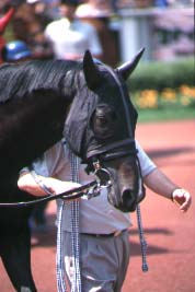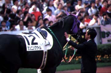本日の大本命メジロブライトとランニングゲイルの登場。ブライトは入れ込み気味でしたが馬体は文句なし | |